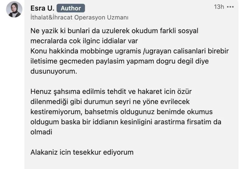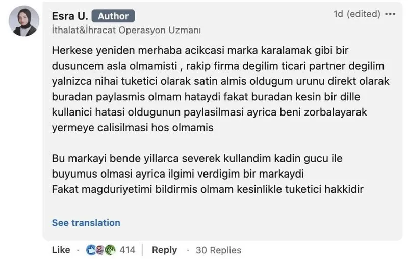 Bu markayı ben de yıllarca severek kullandım kadın gücü ile büyümüş olması ayrıca ilgimi verdiği bir markaydı. Fakat mağduriyetimi bildirmiş olmam kesinlikle tüketici hakkıdır. Ne yazık ki bunları da üzülerek okudum farklı sosyal mecralarda çok ilginç iddialar var konu hakkında mobbinge uğramış /uğrayan çalışanları birebir iletişime geçmeden paylaşım yapmam doğru değil diye düşünüyorum. Henüz şahsıma edilmiş tehdit ve hakaret için özür dilenmediği gibi durumun seyri ne yöne evrilecek kestiremiyorum, bahsetmiş olduğunuz benim de okumuş olduğum başka bir iddianın kesinliğini araştırma fırsatım da olmadı Alakanız için teşekkür ediyorum”